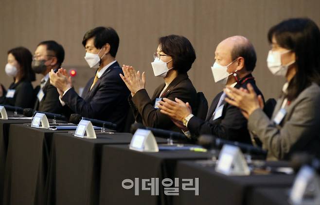 [이데일리 김태형 기자] 임혜숙(오른쪽 세번째) 과학기술정보통신부 장관 등이 11일 오후 서울 강남구 한국과학기술단체총연합회에서 열린 2022년 과학기술인·정보방송통신인 신년인사회에 참석하고 있다.