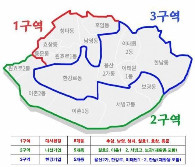 구는 폐기물 배출량이 많은 보광동과 한남동은 폐기물 통합 수거를 도입했다. 직영업체가 담당했던 재활용 폐기물 수거를 해당 구역 대행업체에 맡겨 다른 폐기물들과 함께 수거하는 방식이다. 성장현 용산구청장은 "청소구역 통폐합으로 폐기물 수거 비용이 줄고 주민 불편도 해소될 것"이라고 말했다.
