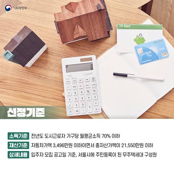 - 소득기준: 전년도 도시근로자 가구당 월평균소득 70% 이하