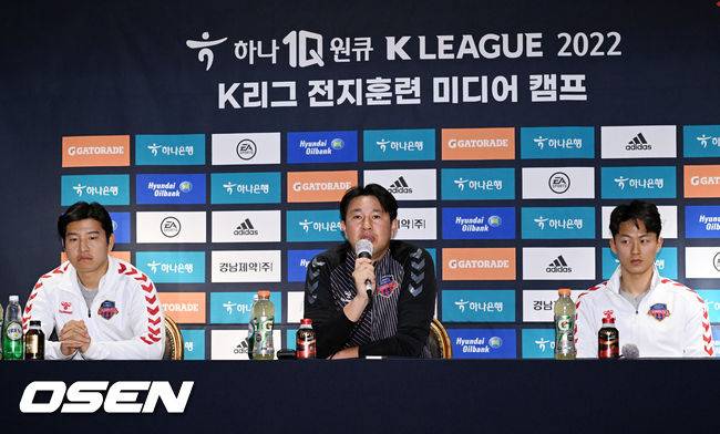 수원FC 김도균 감독과 이승우, 박주호가 기자회견을 하고 있다. 2022.01.11 /rumi@osen.co.kr