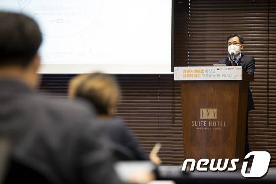 (서울=뉴스1) = 홍정기 환경부차관이 11일 오후 서울 중구 ENA스위트호텔에서 환경부-IUCN 공동주최로 열린 '자연기반해법 확산과 생물다양성 보전 세미나'에서 개회사를 하고 있다. (환경부 제공) 2022.1.11/뉴스1
