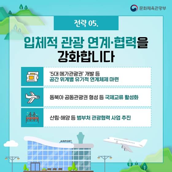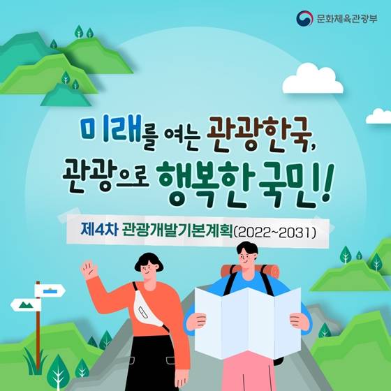 매력적인 관광자원을 발굴합니다 - 미래유망기술이 집약된 신개념 관광자원 발굴 - 한국 드라마 등 세계적 관심을 받고 있는 문화·예술 콘텐츠 관광자원화 - 일과 휴가를 병행하는 '워케이션' 관광지 조성 등 최신 관광 흐름에 맞는 관광개발 추진 [전략 2] 지속가능한 관광개발 가치를 구현합니다 - 노후 관광지를 친환경으로 새단장하는 등 탄소중립 관광개발 추진 - 보전과 활용이 조화된 생태관광 육성 - 폐산업시설 등 유휴자원도 활용·재생해 관광자원화 [전략 3] 편리한 관광편의기반을 확충합니다 - 정보통신기술(ICT)을 활용해 끊김 없는 관광교통체계 구축 - 코로나19 이후 부각되고 있는 안전·안심 관광환경 구현 - 숙박·식음·쇼핑시설을 관광목적지로 인식할 수 있는 관광 명소 조성 [전략 4] 건강한 관광산업생태계를 구축합니다 - '관광두레 2.0' 등 주민참여형 지역관광 추진 - 청년층 중심의 지역관광활동가를 발굴·육성 - 관광벤처 창업과 지역관광상권 활성화를 위한 다양한 정책 지원 [전략 5] 입체적 관광 연계·협력을 강화합니다 - '5대 메가관광권' 개발 등 공간 위계별 유기적 연계체제 마련 - 동북아 공동관광권 형성 등 국제교류 활성화 - 산림·해양 등 범부처 관광협력 사업 추진 [전략 6] 혁신적 제도·관리 기반을 마련합니다 - 국가관광지 지정제와 관광개발계획 평가제 도입 등 제도 개선 - 관광 분야 거대자료(빅데이터) 활용 강화 등 데이터에 기반한 과학적 관광자원 관리 문화체육관광부는 '제4차 관광개발기본계획(2022년~2031년)'을 통해 국제관광 시장에서 한 단계 도약하고, 국민들이 관광을 통해 마음의 위안을 얻으며, 관광개발의 성과가 지역의 일자리 창출과 소득증대에 기여할 수 있기를 기대합니다.