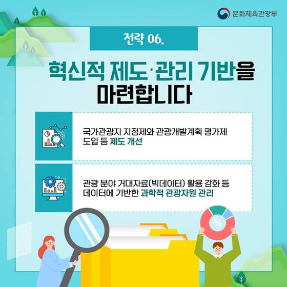 관광자원을 효율적으로 개발하고 관리하기 위한 문화체육관광부의 '제4차 관광개발기본계획' 6대 추진 전략을 살펴보세요! ▶ '제4차 관광개발기본계획(2022년~2031년)'이란? 향후 10년 동안 관광개발의 바람직한 미래상을 제시하는 최상위계획으로서 관광진흥법 제49조에 따라 수립되는 법정계획입니다.