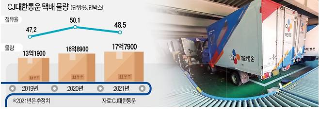 2020년 50%를 웃돌던 CJ대한통운의 택배 시장 점유율은 지난해 48%대로 하락했다.