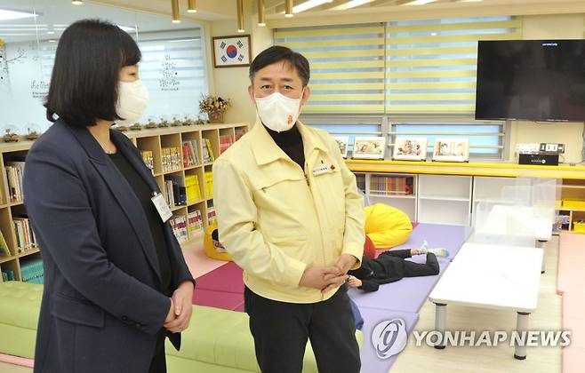 (서울=연합뉴스) 양성일 보건복지부 제1차관(오른쪽)이 11일 서울시 강동구 다함께돌봄센터를 방문해 코로나19 방역 관리 상황을 점검하고 있다. 2022.1.11
