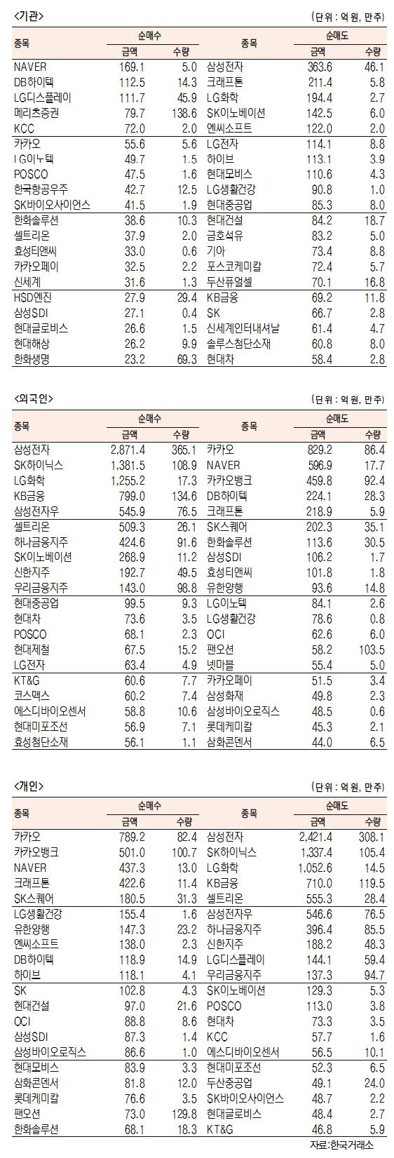 - [표]주간 유가증권 기관·외국인·개인 순매수·순매도 상위종목(1월3~7일)