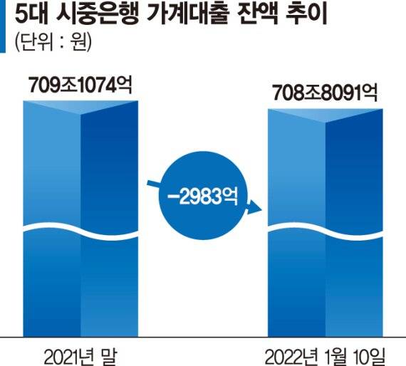 11일 업계에 따르면 5대 시중은행(KB국민·신한·하나·우리·NH농협)의 가계대출 잔액은 지난 10일 기준으로 708조8091억원을 기록했다. 지난해 말(709조1074억원) 대비 2983억원 줄었다.
