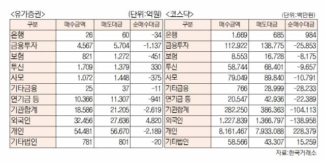[표]유가증권 코스닥 투자주체별 매매동향(1월 11일-최종치)