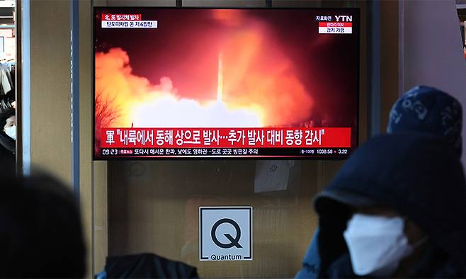 | 또… 11일 서울역 대합실에서 시민들이 북한의 미사일 발사 관련 뉴스를 시청하고 있다. 합동참모본부는 이날 북한이 동해상으로 탄도미사일로 추정되는 발사체를 쐈다고 밝혔다. 남정탁 기자 |