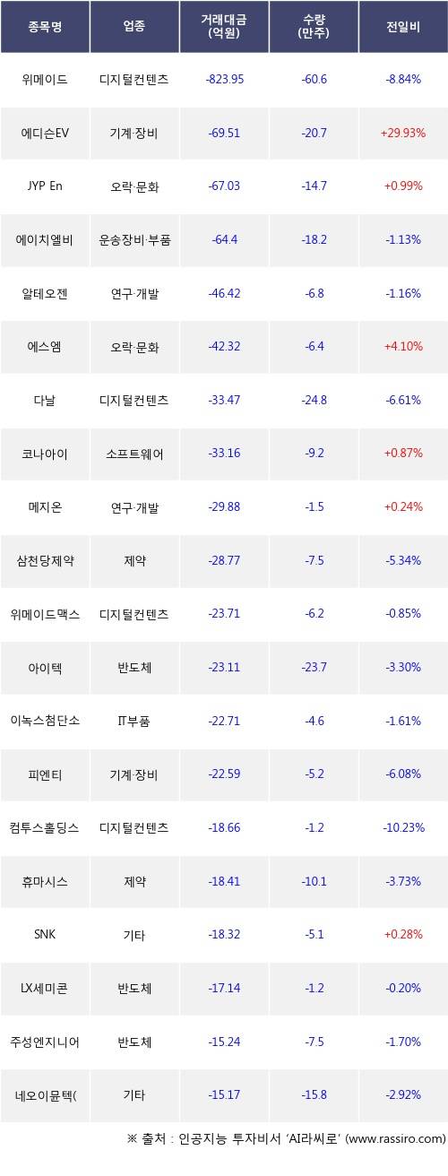 외국인 투자자의 순매도 상위 20개 종목은 위메이드, 에디슨EV, JYP Ent., 에이치엘비, 알테오젠, 에스엠, 다날, 코나아이, 메지온, 삼천당제약등이다.