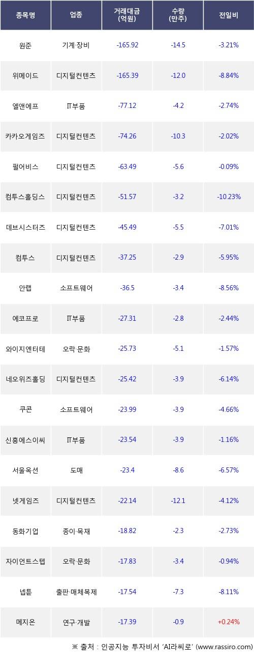 기관 투자자의 순매도 상위 20개 종목은 원준, 위메이드, 엘앤에프, 카카오게임즈, 펄어비스, 컴투스홀딩스, 데브시스터즈, 컴투스, 안랩, 에코프로등이다.