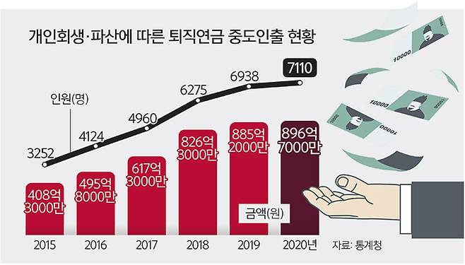 코로나19가 본격적으로 확산한 2020년 개인회생이나 파산 등 생활고를 이유로 퇴직연금을 중도 인출한 사람이 역대 최다를 기록했다.