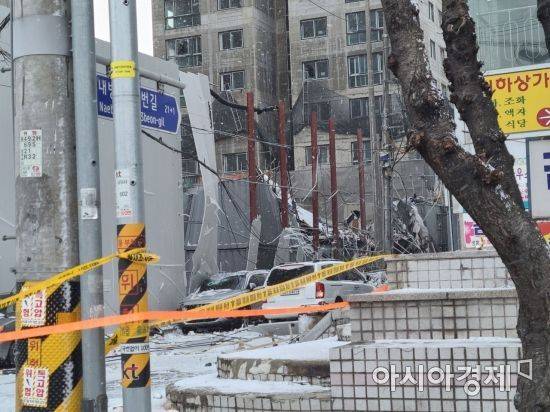 무너져 내린 건축물 잔해물에 주변 주·정차 차량 20여대가 파손되기도 했다.