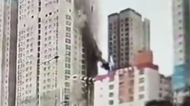 39층 고층 아파트의 한쪽 벽면이 거대한 먼지바람을 일으키며 와르르 쏟아져내립니다.