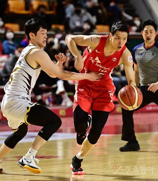 11일 서울 잠실학생체육관에서 열린 ‘2021-2022 KGC 인삼공사 정관장 프로농구’ 서울SK와 창원LG의 경기에서 SK 김선형이 LG 한상혁의 수비를 뚫고 드리블 돌파하고 있다.