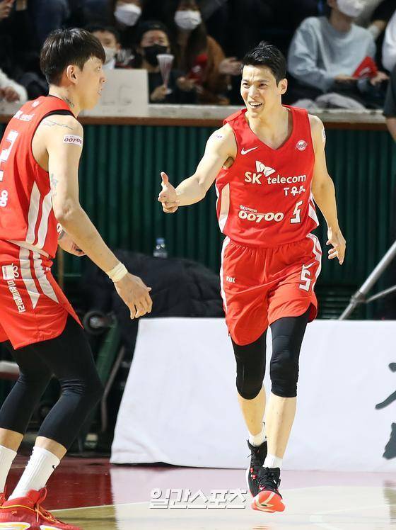 2021-2022 프로농구 서울SK와 창원LG의 경기가 11일 오후 서울 잠실학생체육관에서 열렸다. 김선형이 3점슛을 성공시키고 환하게 웃고 있다.