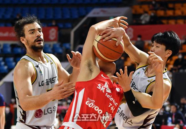 SK 오재현이 11일 잠실학생체육관에서 열린 2021-22프로농구 서울SK와 창원LG의 경기에서 돌파를 시도하다 LG 이승우, 마레이와 뒤엉키고 있다.2022.01.11.