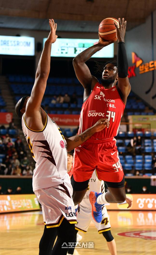 SK 워니가 11일 잠실학생체육관에서 열린 2021-22프로농구 서울SK와 창원LG의 경기에서 사무엘스를 따돌리며 원핸드슛을 시도하고 있다.2022.01.11.