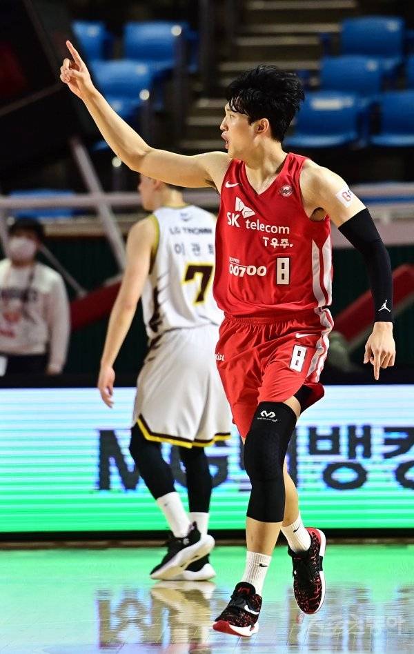 11일 서울 잠실학생체육관에서 열린 ‘2021-2022 KGC 인삼공사 정관장 프로농구’ 서울SK와 창원LG의 경기에서 SK 안영준이 3점슛을 성공시킨 후 기뻐하고 있다.