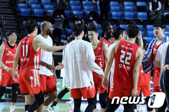 (서울=뉴스1) 황기선 기자 = 11일 오후 서울 송파구 잠실학생체육관에서 열린 '2021-2022 KGC 인삼공사 정관장 프로농구' 서울 SK와 창원 LG와의 경기에서 84대 76으로 승리한 SK 선수들이 기뻐하고 있다. 2022.1.11/뉴스1