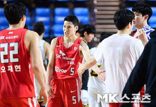 서울 SK 김선형이 동료들과 승리의 기쁨을 나누고 있다.