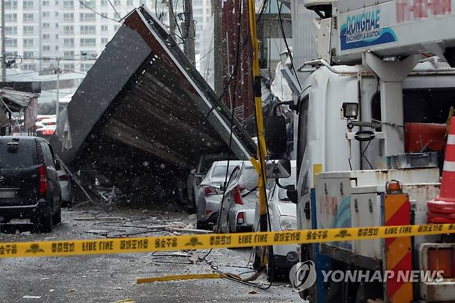 (광주=연합뉴스) 정회성 기자 = 11일 오후 광주 서구 화정동 현대아이파크 주상복합아파트 신축 현장에서 외벽 일부가 무너져내리는 사고가 나 붕괴물 잔해에 쓰러진 담장이 주변에 세워진 차량을 덮치고 있다. 2022.1.11