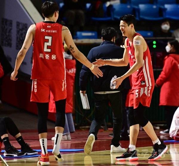 11일 서울 잠실학생체육관에서 열린 ‘2021-2022 KGC 인삼공사 정관장 프로농구’ 서울SK와 창원LG의 경기에서 LG에 84-76으로 승리를 거둔 SK 김선형이 동료와 기쁨을 나누고 있다.