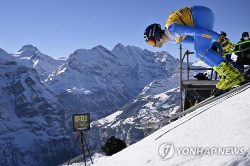 epa09678450 Matteo Marsaglia of Italy in action during a training session of the men's downhill race at the FIS Alpine Skiing World Cup event in Wengen, Switzerland, 11 January 2022. EPA/JEAN-CHRISTOPHE BOTT
