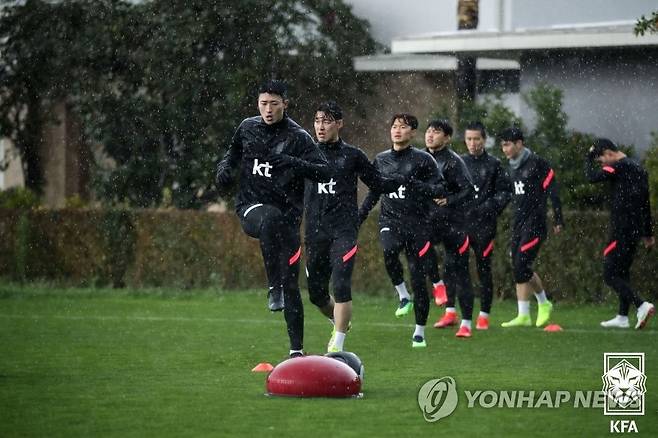 (서울=연합뉴스) 파울루 벤투 감독이 이끄는 한국 축구 대표팀 조규성 김진수 등이 11일 전지 훈련지인 터키 안탈리아 코넬리아 다이아몬드 필드에서 훈련하고 있다. 2022.1.11 [대한축구협회 제공. 재판매 및 DB금지]