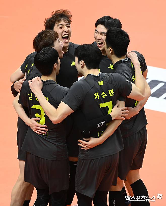 (엑스포츠뉴스 안산, 고아라 기자) 11일 오후 경기도 안산 상록수체육관에서 열린 '2021-2022 도드람 V리그' 남자부 OK금융그룹과 현대캐피탈의 경기, 현대캐피탈이 득점한 뒤 기뻐하고 있다.