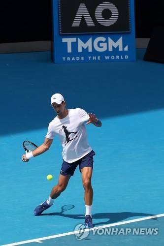 epa09678482 Novak Djokovic of Serbia during a practice session ahead of the Australian Open, at Melbourne Park in Melbourne, Victoria, Australia, 11 January 2022. EPA/KELLY DEFINA / POOL AUSTRALIA AND NEW ZEALAND OUT