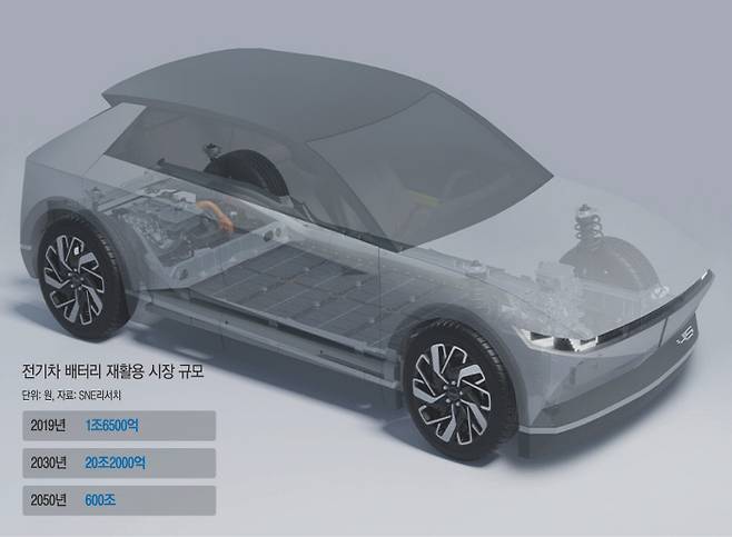 2020년 275개에 불과했던 국내 전기차 폐배터리는 2025년 3만1696개, 2030년엔 10만7520개로 늘어날 것으로 환경부는 전망했다. 에너지 시장 조사업체 SNE리서치는 2019년 1조6500억원이던 전기차 배터리 재활용 시장이 2030년 20조2000억원, 2050년엔 600조원까지 급성장할 것으로 예상했다.
