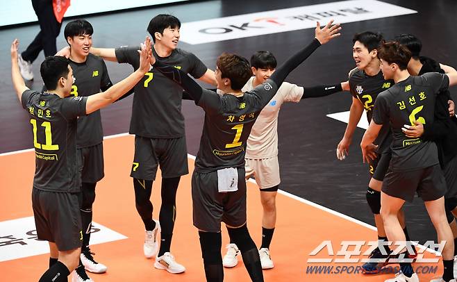 2021-2022 V리그 남자부 OK금융그룹과 현대캐피탈의 경기가 11일 안산상록수체육관에서 열렸다. 경기에서 승리한 현대캐피탈 선수들이 기뻐하고 있다. 안산=박재만 기자 pjm@sportschosun.com/2022.01.11/