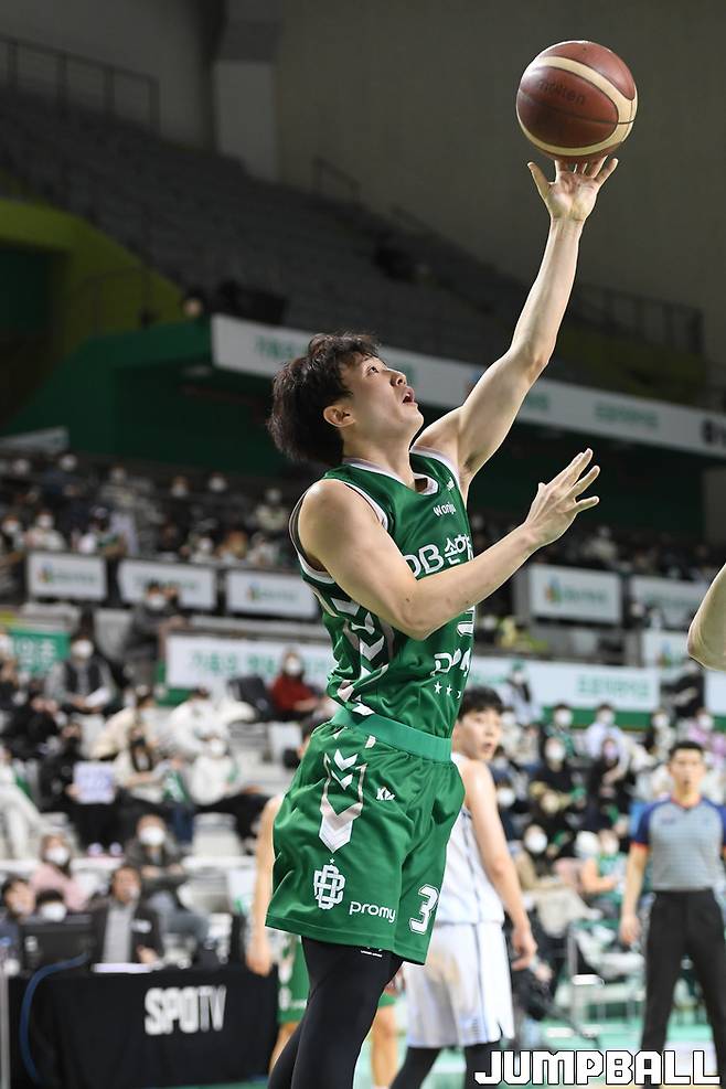11일 원주종합체육관에서 열린 2021-2022 KGC인삼공사 정관장 프로농구 원주 DB와 전주 KCC의 경기, DB 허웅이 골밑에서 슛을 시도하고 있다.