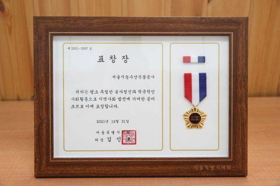 서울시농수산식품공사(사장 문영표)는 소외된 이웃을 위해 후원과 봉사를 적극 실천하고 지역사회 발전에 기여한 공로를 인정받아 서울시의회(의장 김인호)와 한국자원봉사협의회(상임대표 라제건)로부터 표창장을 수상했다.