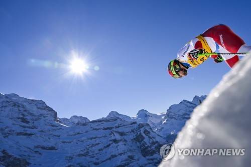 epa09678604 Justin Murisier of Switzerland in action during a training session of the men's downhill race at the FIS Alpine Skiing World Cup event in Wengen, Switzerland, 11 January 2022. EPA/JEAN-CHRISTOPHE BOTT