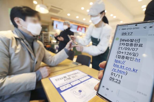 KT는 경기 고양시에서 전화 한 통으로 백신 접종 여부를 확인할 수 있는 ‘안심콜 방역패스’ 서비스를 시범 운영 중이라고 11일 밝혔다. 고양시에 있는 제과점에서 방문객이 안심콜 방역패스로 백신 접종 여부를 확인하고 있다.