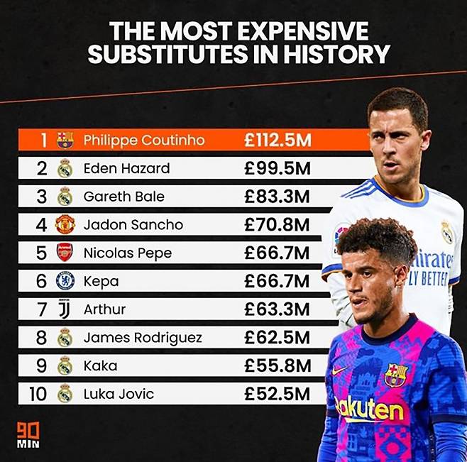 영국 매체 '90min'은 11일 '역대 가장 비싼 몸값의 서브 자원 선수 순위 톱 10'을 공개했다. 1~10위 모두 기대 이하의 활약으로 벤치를 달군 선수들이다.