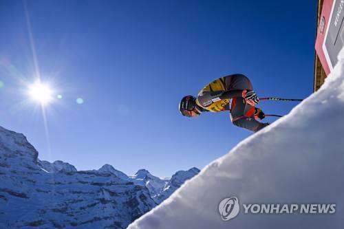 epa09678662 Adrian Smiseth Sejersted of Norway in action at the start during a training session of the men's downhill race at the FIS Alpine Skiing World Cup event in Wengen, Switzerland, 11 January 2022. EPA/JEAN-CHRISTOPHE BOTT