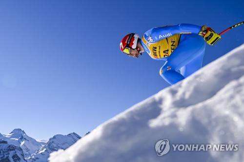 epa09678714 Mattia Casse of Italy in action at the start during a training session of the men's downhill race at the FIS Alpine Skiing World Cup event in Wengen, Switzerland, 11 January 2022. EPA/JEAN-CHRISTOPHE BOTT