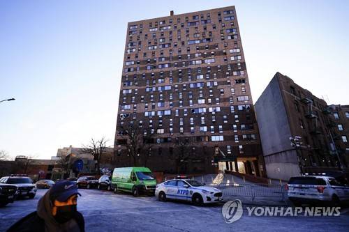 A person walks past an apartment building which suffered the city's deadliest fire in three decades, in the Bronx borough of New York, Tuesday, Jan. 11, 2022. A malfunctioning electric space heater apparently started the fire Sunday in the 19-story building in the Bronx, fire officials said. (AP Photo/Matt Rourke)