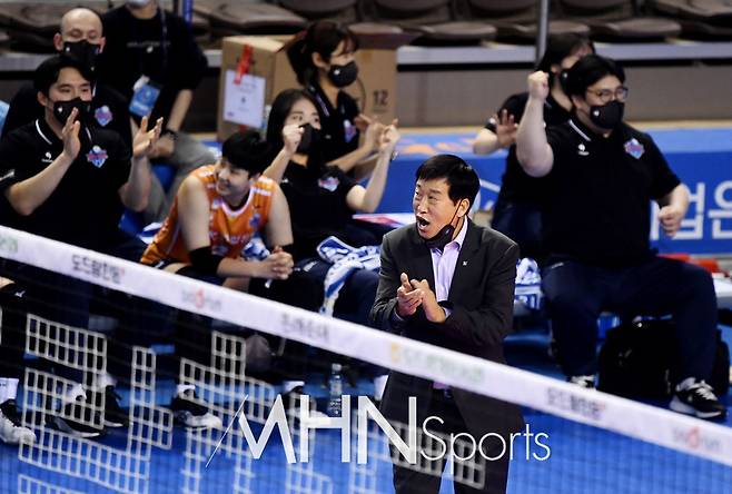 김호철 IBK기업은행 감독과 벤치의 코칭스태프가 선수들에게 박수를 보내고 있다.
