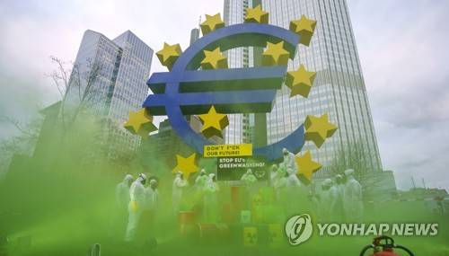epa09678866 Activists of KoalaKollektiv during a protest in front of the Euro sign in Frankfurt am Main, Germany, 11 January 2022. The KoalaKollektiv protest s against the greenwashing of nuclear energy and natural gas by the taxonomy of the EU. The Kollektiv calls on the German government to vote in the EU Council of Ministers with a clear against the EU Commission's taxonomy proposal and to support the planned lawsuit of Austria and Luxembourg. EPA/RONALD WITTEK