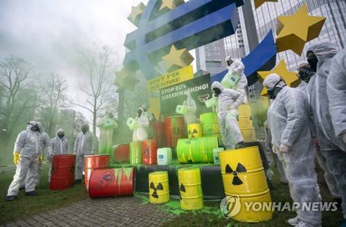 epa09678879 Activists of KoalaKollektiv during a protest in front of the Euro sign in Frankfurt am Main, Germany, 11 January 2022. The KoalaKollektiv protest s against the greenwashing of nuclear energy and natural gas by the taxonomy of the EU. The Kollektiv calls on the German government to vote in the EU Council of Ministers with a clear against the EU Commission's taxonomy proposal and to support the planned lawsuit of Austria and Luxembourg. EPA/RONALD WITTEK