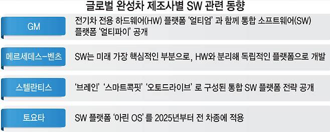 최근 폐막한 CES 2022 전시회에서 여러 완성차 업체의 의미 있는 발표가 있었다. 메리 배라 제너럴모터스(GM) 회장은 전기차 픽업트럭 실버라도 출시 계획을 알리면서 전기차전용 하드웨어(HW) 플랫폼 '얼티엄'과 통합 소프트웨어(SW) 플랫폼 '얼티파이'를 소개했다. 배라 CEO는 “HW와 SW 플랫폼을 통해 모든 이들의 일상을 혁신하고 완전히 전동화된 미래로 이끌 것”이라고 천명했다. 마르쿠스 셰퍼 메르세데스-벤츠 최고기술경영자(CTO)는 한 번 충전으로 1000㎞를 주행하는 콘셉트카 '비전EQXX'를 소개하면서 “SW는 미래 가장 핵심적인 부분으로, HW와 분리해 독립적인 플랫폼으로 개발 진행 중”이라고 밝혔다. 카를루스 타바르스 스텔란티스 대표는 2028년까지 크라이슬러 브랜드를 순수 전기차 브랜드로 전환하겠다는 계획과 함께 스텔란티스 '브레인' '스마트콕핏' '오토드라이브'로 구성되는 통합 SW 플랫폼 전략을 공개했다.