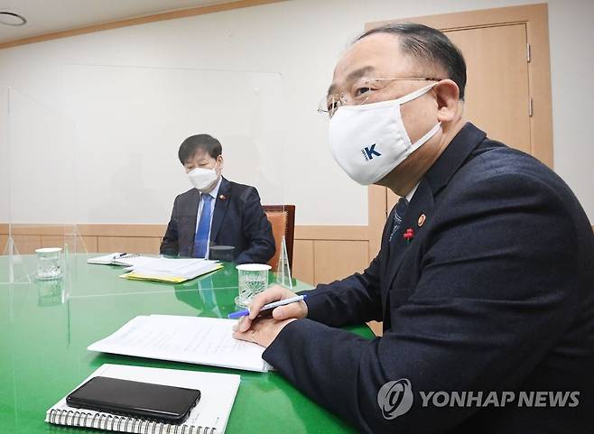 (서울=연합뉴스) 홍남기 부총리 겸 기획재정부 장관이 12일 정부서울청사에서 '2021년 12월 및 연간 고용동향'을 주요 내용으로 관계장관회의(녹실회의)를 주재하고 있다. 2022.1.12