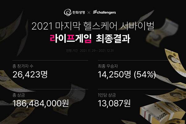 최혁준 화이트큐브 대표는 “챌린저스가 한화생명과 함께 진행한 이번 프로젝트는 챌린저들이 연말을 보람차게 마무리하고 새해에도 꾸준히 좋은 습관을 형성할 수 있도록 준비했다. 2만명이 넘는 대규모의 인원이 라이프게임에 적극적으로 도전했으며 기대 이상의 높은 달성률을 기록한 것 같다”며 “새로 맞이한 2022년에도 챌린저들의 건강하고 좋은 습관 형성을 도와 건강한 삶을 이룰 수 있도록 대규모 챌린지를 더욱 다양하게 운영할 예정”이라고 전했다.