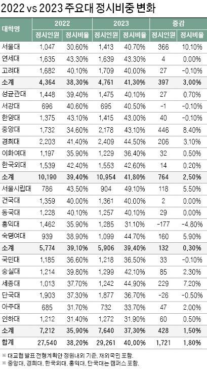 한국대학교육협의회(대교협) 발표 전형계획안 기준 2023학년도 서울대, 연세대, 고려대 등 SKY의 정시 선발인원은 총 4761명(41.3%)에 달한다. 고려대의 정시 선발인원이 1709명(40.0%)으로 가장 많고, 연세대 1639명(43.3%), 서울대 1413명(40.7%) 순이다. 특히 서울대의 증가폭이 눈에 띄는데, 전년 대비 정시 선발인원이 366명 늘면서 정시 비중은 40%를 넘어섰다.