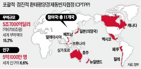 ○포괄적·점진적 환태평양경제동반자협정(CPTPP: Comprehensive and Progressive Agreement for Trans-Pacific Partnership)=일본, 호주, 캐나다, 싱가포르 등 태평양 연안 11개국이 가입한 다자 간 자유무역협정(FTA)이다. 2018년 12월 30일 발효됐다. 중국과 대만은 지난해 가입 의사를 밝혔다. 한국도 지난해 12월 CPTPP 가입 추진을 공식 선언했다.