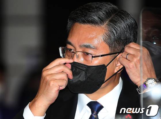 (서울=뉴스1) 김진환 기자 = 서욱 국방장관이 12일 오전 서울 중구 웨스틴 조선호텔에서 열린 디펜스 2040 컨퍼런스에서 마스크를 고쳐 쓰고 있다. 2022.1.12/뉴스1